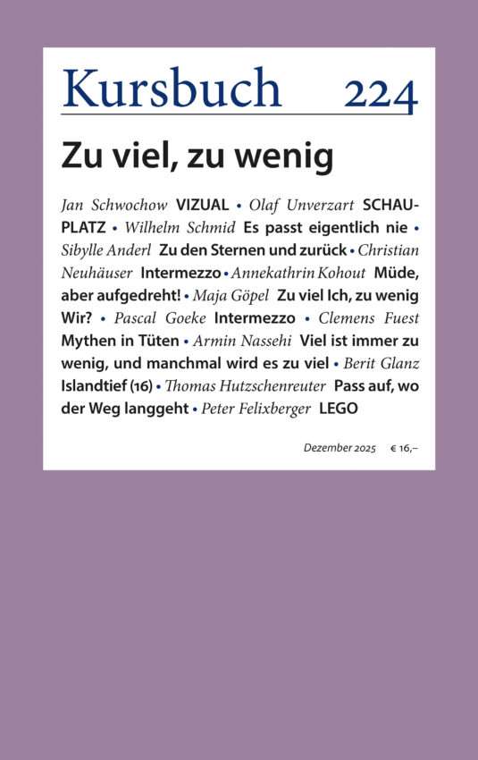 Die Kulturzeitschrift Kursbuch ist seit ihrer Gründung 1965 einer der wichtigsten kritischen Begleiter der bundesdeutschen Öffentlichkeit. Mit der Veränderung der Gesellschaft verändert sich auch das Kursbuch. Im Themendickicht unserer komplexen Gegenwart versucht es, neue Schneisen zu schlagen und überraschende, ungewohnte Verbindungen zwischen Schon-Gesagtem und Noch-zu-Diskutierendem auszuloten. Nicht die großen Unterschiede werden diskutiert, sondern das, was einen Unterschied macht.